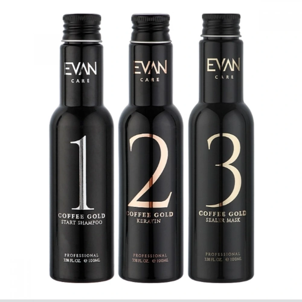 Set composition: (step 1) - Evan Care Coffee Gold Start Shampoo (mini), 100 ml + Keratin (step 2) - Evan Care Coffee Gold Step 2 Keratin (mini), 100 ml + Hair mask (step 3) - Evan Care Coffee Gold Sealer (mini), 100 ml